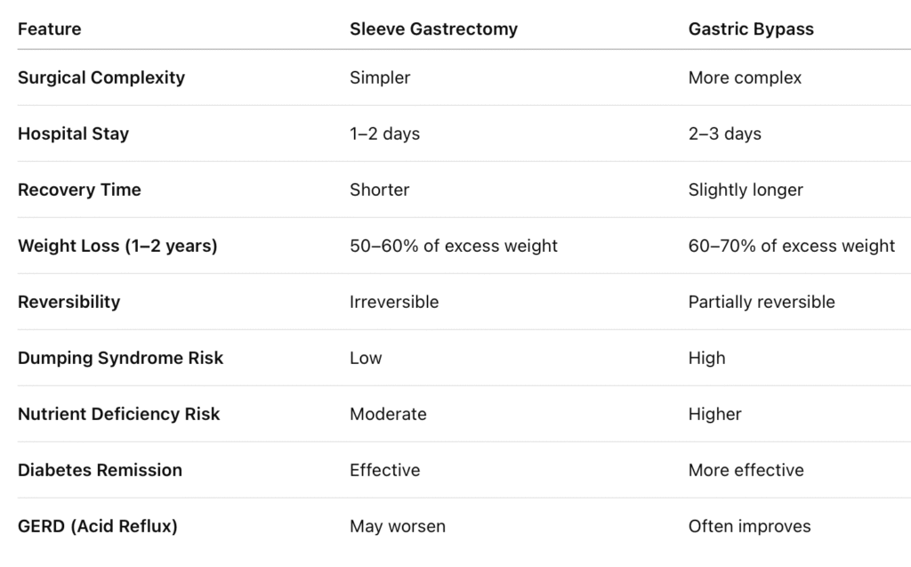 Sleeve Gastrectomy typically requires a hospital stay of 1–2 days and a recovery period of 2–4 weeks. Gastric Bypass usually involves a slightly longer hospital stay (2–3 days) and a recovery time of 3–6 weeks.